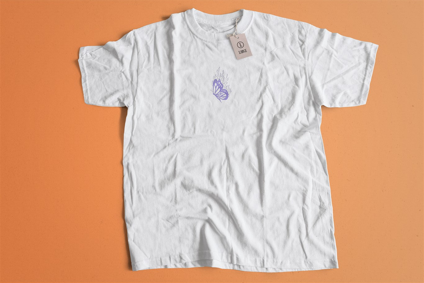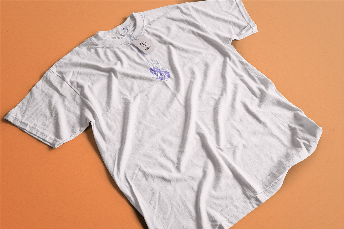 Inspired by simplicity, this unique design features a minimal purple butterfly print on the front, combining elegance with a sense of freedom. Made from 100% cotton, it offers a soft touch and all-day comfort.